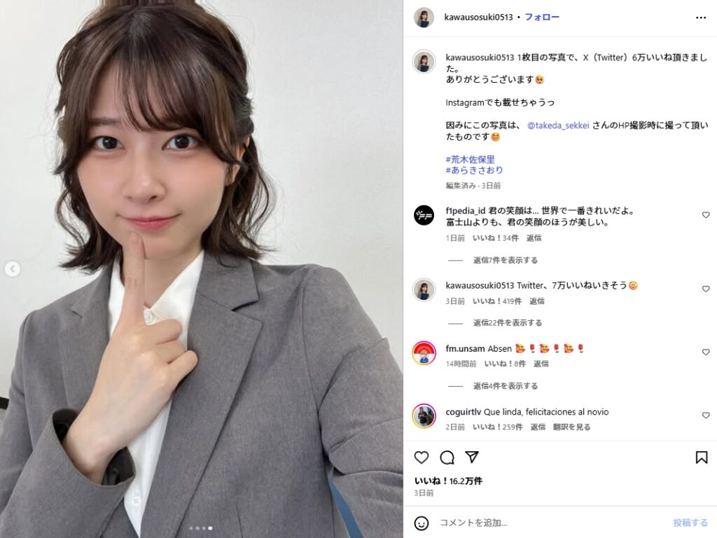荒木は7月25日にXを更新し、スーツ姿の自身の写真とともに「おはよう」と投稿しました。