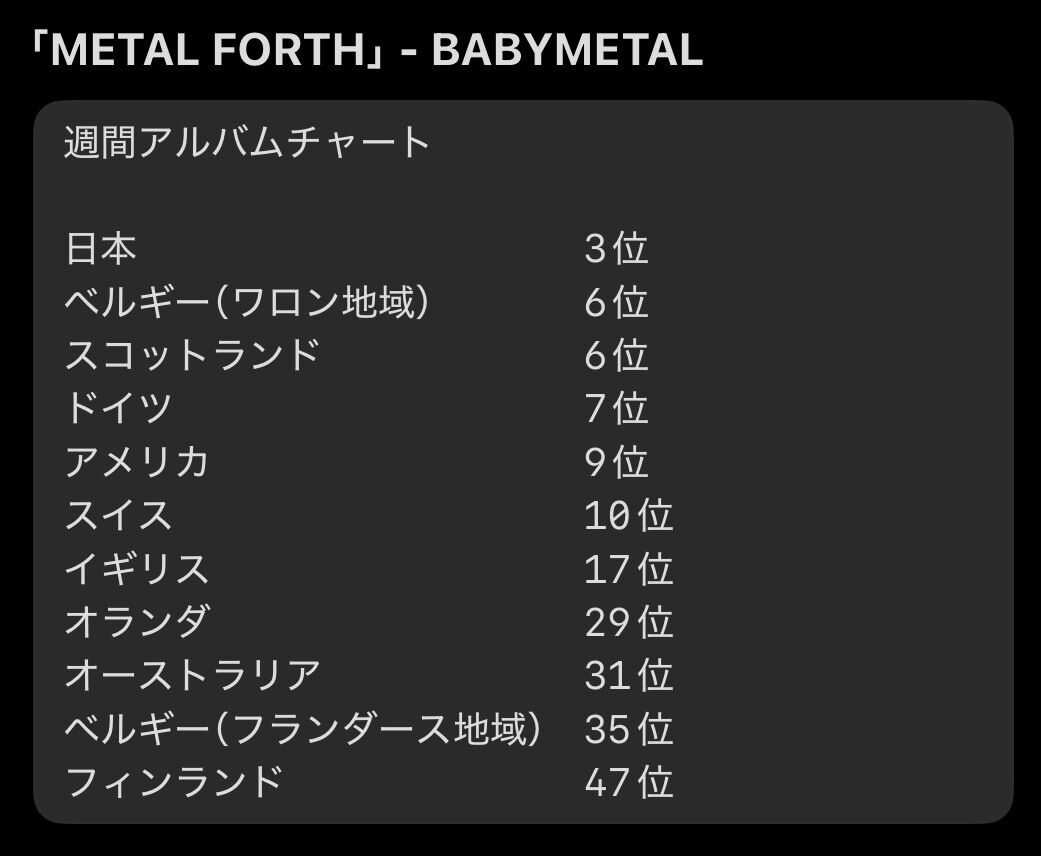 Billboard 200では、1963年の坂本九「Sukiyaki and Other Japanese Hits」が14位を記録。BABYMETALは2016年発表の「METAL RESISTANCE」が39位となり、その後2019年の「METAL GALAXY」が13位に。日本人だけで構成されたグループとしての記録を塗り替えた。そして今回「METAL FORTH」ではBABYMETALの自己最高記録を上回る9位となり、全米総合アルバムチャートでトップ10入りという快挙を成し遂げることとなった。この記録は日本人グループにおける日本語歌唱アルバムとしても初めてのことだ。BABYMETALは「私たちは皆さんと共に『メタルのその先へ』と進み、どんどんとキャリアが更新されています」とコメントしている。