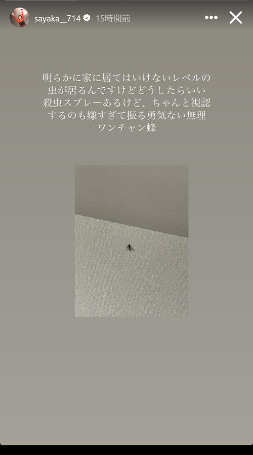 山本はストーリーズで、部屋の壁にとまった虫を撮した写真を貼り付け「明らかに家に居てはいけないレベルの虫が居るんですけどどうしたらいい」と困惑。「殺虫スプレーもあるけど、ちゃんと視認するのも嫌すぎて振る勇気ない無理」と吐露し、その虫については「ワンチャン蜂」とつづっていた。